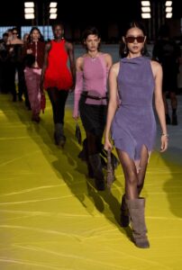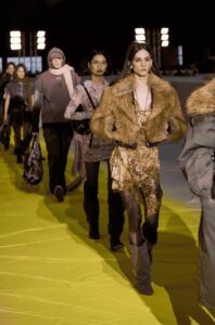Las siluetas abrazan el eclecticismo y el volumen: pantalones cargo convertidos en prendas sofisticadas gracias a bolsillos con estructuras; chaquetas oversize de piel con efecto denim; abrigos jacquard con mensajes de la colección y siluetas entalladas; y la bomber reinterpretada con cuello y forro de pelo, que equilibra lo urbano con lo artesanal. Los vestidos de seda asimétricos, teñidos a mano evocan prendas icónicas portadoras del ADN de la marca, y se complementan con piezas de punto tricot cashmere, lana y mohair.